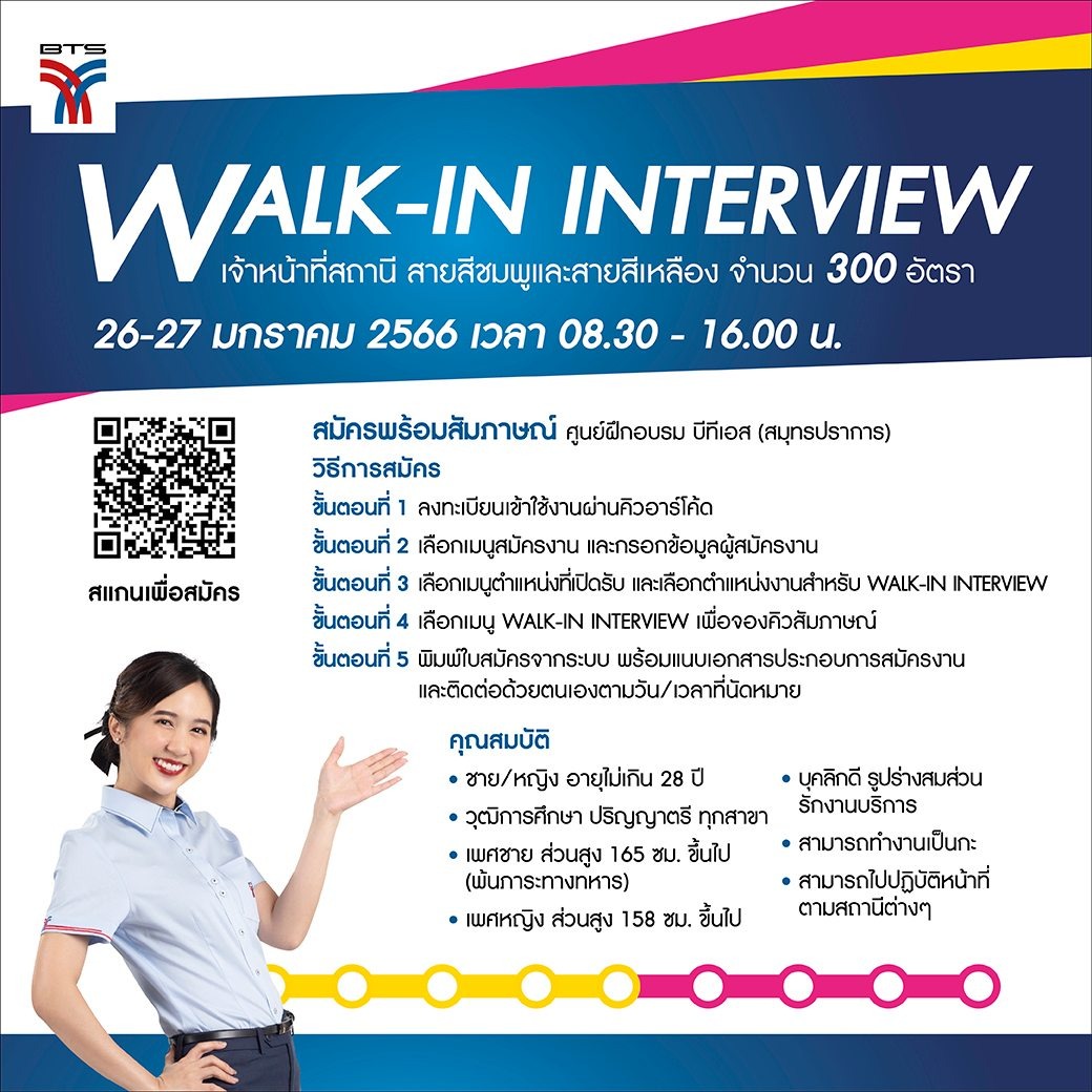 - สมัครพร้อมสัมภาษณ์ทันที ณ ศูนย์ฝึกอบรม บีทีเอส (สมุทรปราการ) 26 - 27 มกราคม พ.ศ. 2566 เวลา 08.30 - 16.00 น.