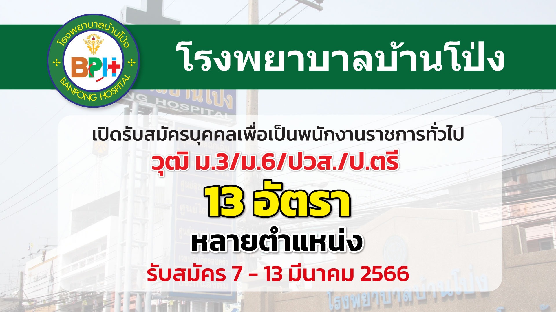 - ให้ผู้ประสงค์จะสมัคร ขอและยื่นใบสมัครด้วยตนเอง ที่กลุ่มงานทรัพยากรบุคคล ตึกอำนวยการ ชั้น 2 โรงพยาบาลบ้านโป่ง อ.บ้านโป่ง จ.ราชบุรี ตั้งแต่วันที่ 7 - 13 มีนาคม 2566 ในวันและเวลาราชการ (โปรดแต่งกายสุภาพเรียบร้อย)